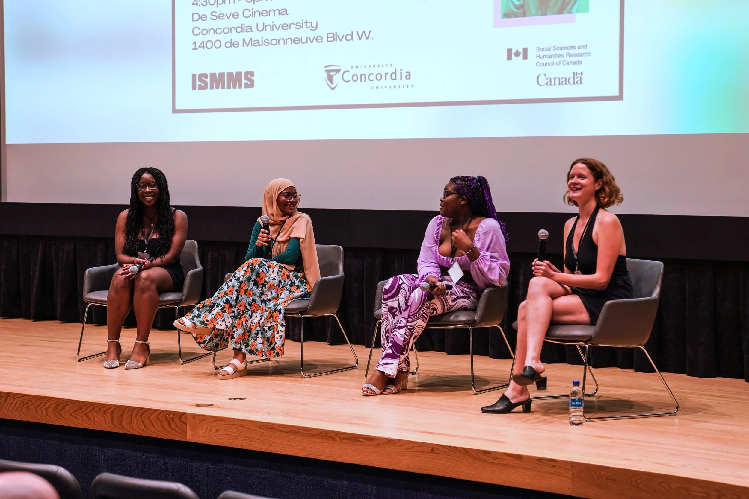 Youth collaborators Kaymarie Sutherland, Hunnayna Hemed, and Kendra McDonald, with artist Veronica Mockler at the premiere of their participatory documentary essay titled “Stepping Into Halka” last June at Cinéma De Sève in Tiohtià:ke Montréal as part of the 2023 Summer Institute: Underground Arts as a Catalyst for Pluralism in an Era of Polarization. Supported by the Michaëlle Jean Foundation, Employment and Social Development - Government of Canada, Fonds de recherche du Québec Société et culture - Québec Research Council, and the Social Sciences and Humanities Research Council of Canada.